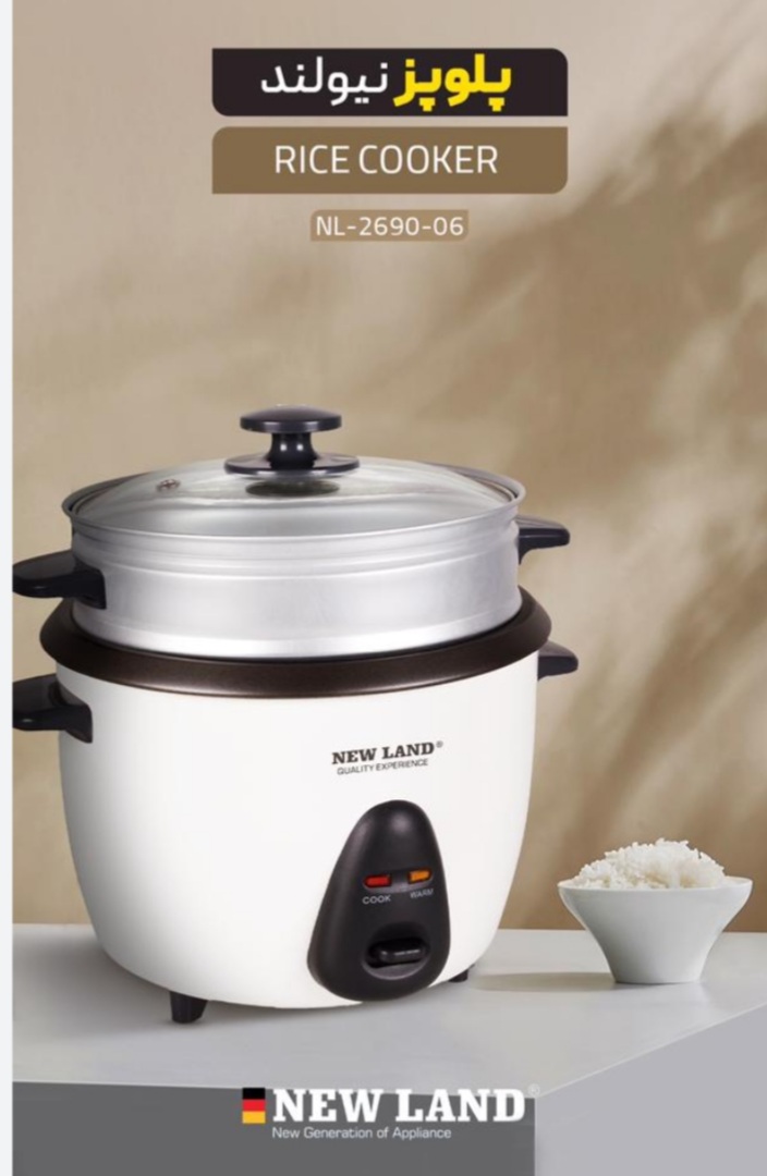 پلوز زودپز نیولند مدل 2690 توان: 350 وات سبد بخارپز: دارد فنجان اندازه گیریدارد دارای کفگیر برنج جنس قابلمه داخلی سرامیک قابل پخت و بخار پز سبزیجات