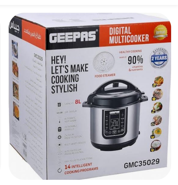 زودپز چندکاره برقی 8 لیتری جیپاس مدل 35029 با ظرفیت 6 لیتری مناسب برای 7 الی 10 نفر می باشد. صفحه کار شده در این زودپز جیپاس کاملا نچسبه و به راحتی قابل جدا شدن و شست و شو در ماشین ظرف شویی می باشد. زود پز چندکاره جیپاس دارای 4 نمایشگر LED صفحه کنترل بزرگ و لمسی استفاده اسان و راحت دارای قفل کودک متریال استیل ضدزنگ بسیار ایمن افزایش سرعت پخت تا 6 برابر عایق بندی کامل درب حفظ کیفیت و عطر و طعم مواد غذایی دارای ارام پز با تایمر 24 ساعته زمان پخت قابل تنظیم فشار پخت 70Kpa توان 1200 وات