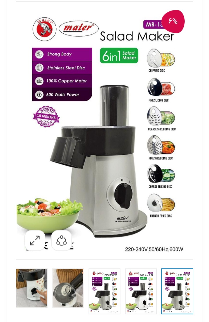 دارای 6 دیسک استیل ضد زنگ برای ورقه کردن ، رنده کردن و خلال کردن سبزیجات: رنده ریز ، رنده درشت ، رنده رشته کن ،رنده خلال کن ، رنده چیپس نازک ، رنده چیپس ضخیم