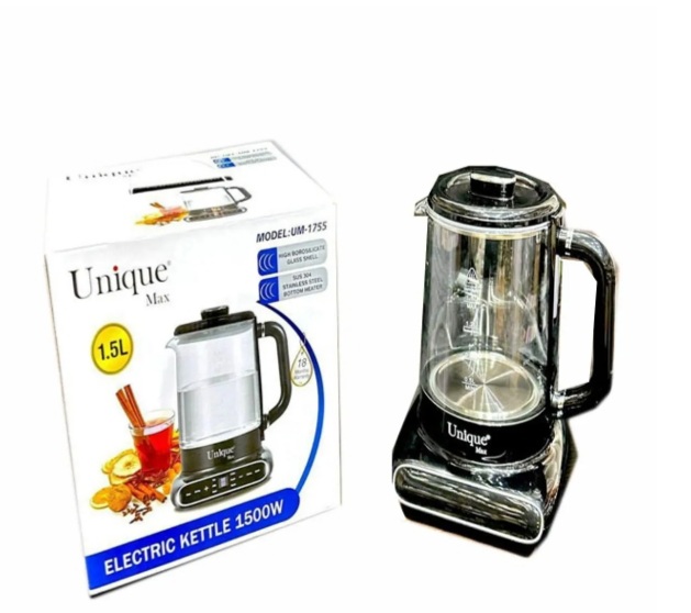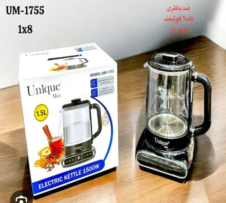 کتری برقی 1500 وات جنس کتری شیشه ای لیکات دارای صحفه ظرفیت یک و نیم لیتری ضد زنگ برند یونیک مدل 1755 گرمکن ار جنس استیل ضدباکتری کاملا هوشمند وارمر دار مناسب برای چایی و دمنوش